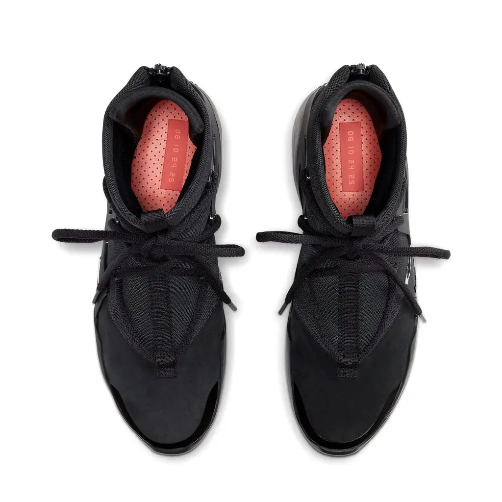 The Air Fear of God 1 ‘Triple Black’ showcases a stealthy monochromatic finish on Jerry Lorenzo’s street-ready basketball shoe. The upper is constructed from black ballistic mesh, reinforced with a suede toe cap and a Huarache Light-inspired TPU frame that delivers containment at the heel and midfoot. A matching black midsole reveals a double-stack Zoom unit, supplemented by internal full-length Zoom Air cushioning.