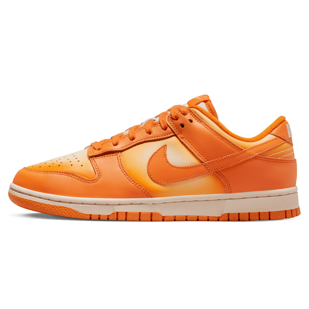 The Nike Women’s Dunk Low ‘Magma Orange’ makes over the vintage hoops shoe with a sun-bleached look. The smooth leather upper features solid orange overlays and a matching signature Swoosh. A unique colour-bleed effect distinguishes the toe box, collar and quarter panel, highlighted by faded centers with concentrated color on the edges. The low-top rests on a traditional rubber cupsole that pairs vintage off-white sidewalls with a grippy orange rubber outsole.